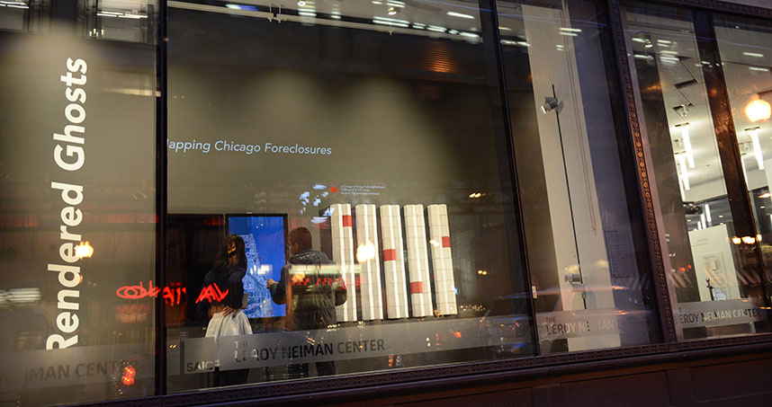 Working with Chicago housing data, the Rendered Ghosts team presented an installation showing recent history and ongoing social and political effects of the foreclosure crisis. An interactive monitor displayed the frequency and location of foreclosures in Cook County, including an in-depth look at the Portage Park neighborhood, which has one of the highest foreclosure rates compared to the rest of the city. The project also included a town of 3-D printed houses that were painted in different colors to represent foreclosure statistics.